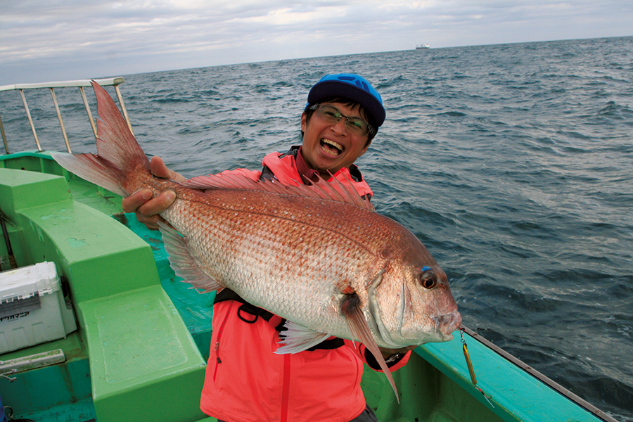 「鹿島沖は遠浅で、砂地、岩盤、魚礁、沈み根と様々なポイントがあり、スーパーライトでは水深30mほどの場所を探っていきます。起伏の激しい場所ではないので、根掛かりも少なく探りやすいですね。SLJはこの地でもやれると前々から思っていて、実際に試したところ、ばっちりハマりました。ちなみにマダイはほぼ周年狙えます。その他、ワカシ、イナダ、ワラサなどの青物、ヒラメ、ホウボウ、メバル、根魚など季節に応じて狙えるので、一年中SLJを楽しめますね」(栗山)