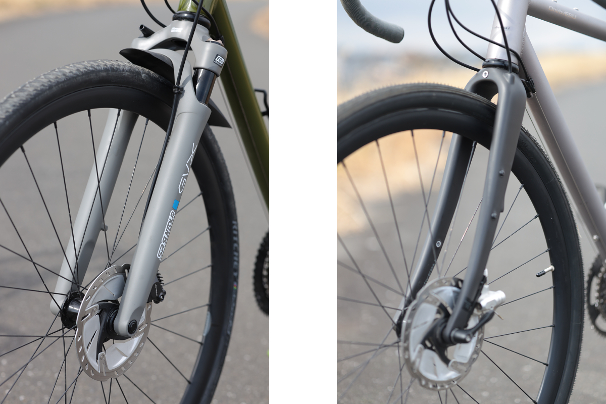Mサイズのフレームにリジッドフォークとサスフォークを装着し比較した。写真では僅差に見えるが、実物を見るとジオメトリは別物。フォークの肩下寸法が伸びると、BBハイトは上がるものの、ヘッド位置が高くなってヘッド角もシート角も寝るため、よりアップライトでゆったりとした挙動のバイクになるはず。「2種類の肩下寸法を入れるジオメトリを最初から入念に考えて作りました。変化を楽しんでください」(上司さん)。