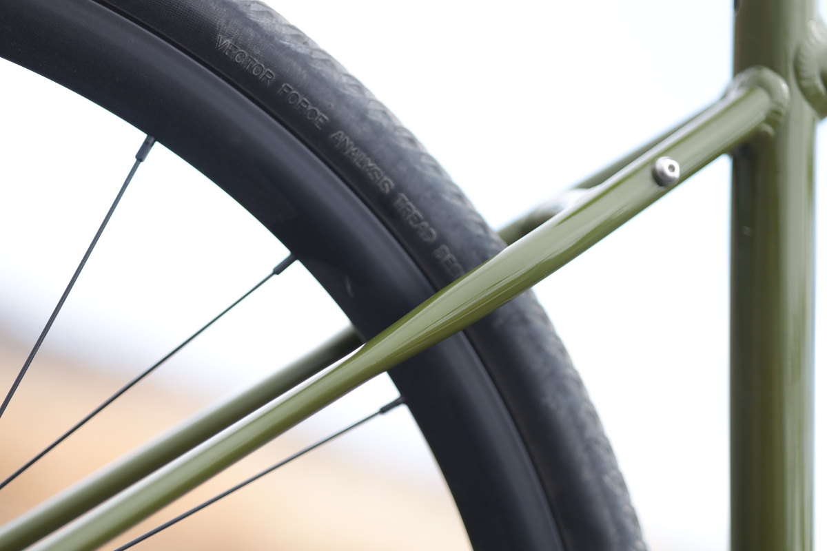 タイヤ通過部のチェーンステー幅は約45mmなので、相当太いタイヤが装着可能だ。リヤセクションには潰しや曲げが施され、悪路での振動吸収性を高める