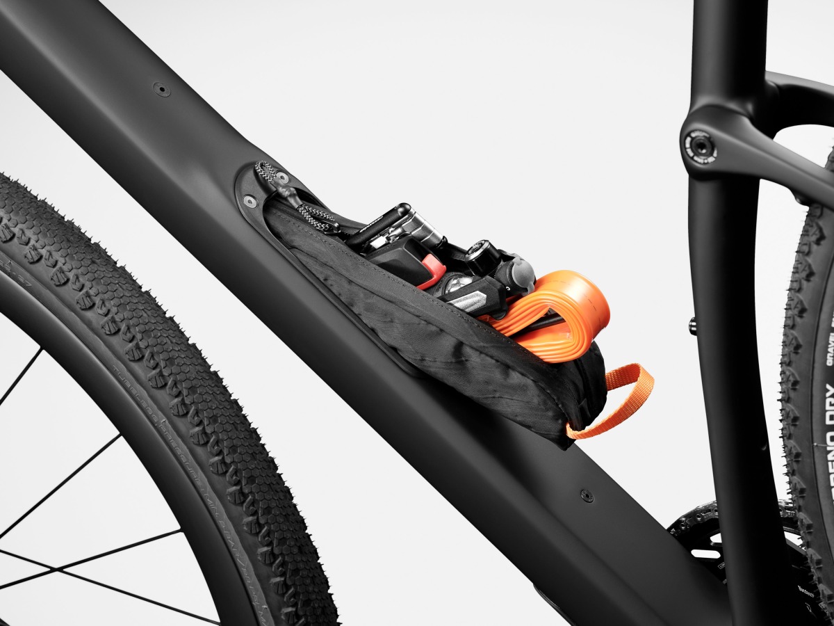 グラベルバイクに求められる実用性という観点では、新型Topstone Carbonに標準装備された「StashPort」(スタッシュポート)収納システムが注目に値する。これはダウンチューブのボトルケージの下に設けられた専用の収納スペースで、付属の「StashBag」(スタッシュバッグ)と組み合わせて使用する。