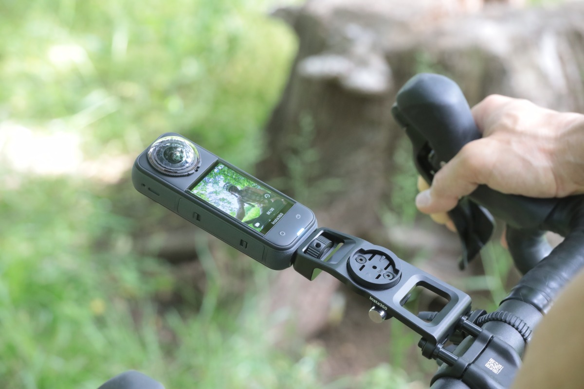 前方に広がる道は、春の緑に包まれていた。教授はX5をハンドルマウントに取り付け、「FlowState手ブレ補正」をONにして記録を開始する。すると驚くほどなめらかに、走る速度とともに風景が流れていく。