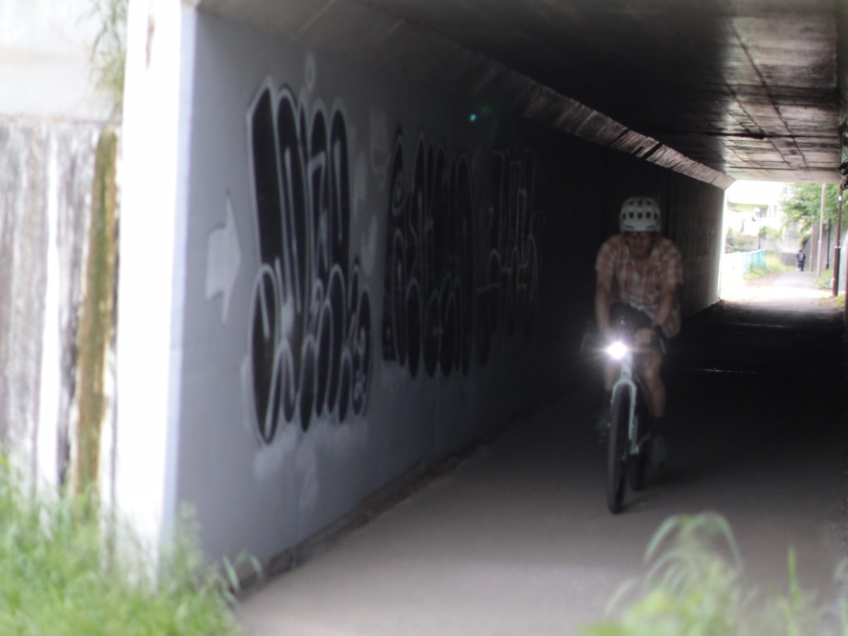 やがて現れた短いトンネル。中は薄暗く、肌寒い空気が流れていた。X5は「PureVideoモード」に切り替え、低照度での撮影に挑む。トンネル内でも、教授の表情や走行の動きがしっかりと記録された。