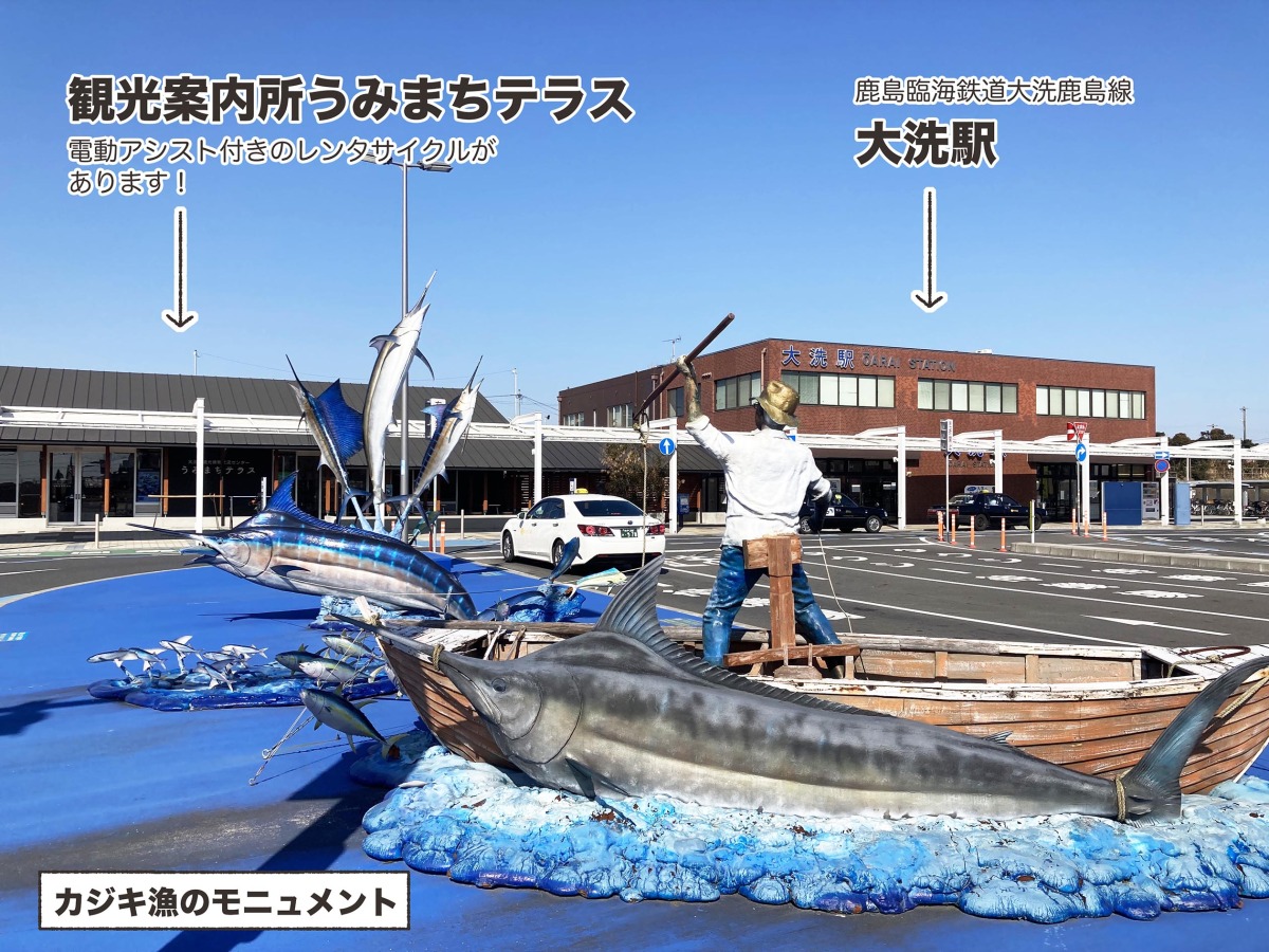 カジキ漁のモニュメントが目を引く大洗駅からスタート!