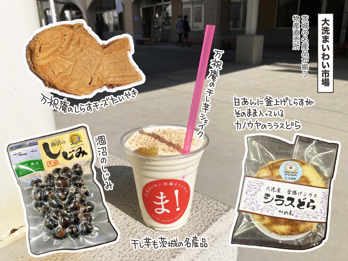 お芋そのものとはまた違った「干し芋」独特の風味が感じられる濃厚な「干し芋シェイク」と、しらすの塩気とチーズのコクがおいしい「たい焼き」で小腹を満たし、お持ち帰りにぴったりな常温可の真空パックの「しじみ」と「しらすどら焼き」をお買い上げ。「しらすどら焼き」は、袋を開けた途端に磯の香りがして一瞬たじろぎますが、食べてみると意外と甘じょっぱくておいしいです。でもしらすの味はしっかりします(笑)