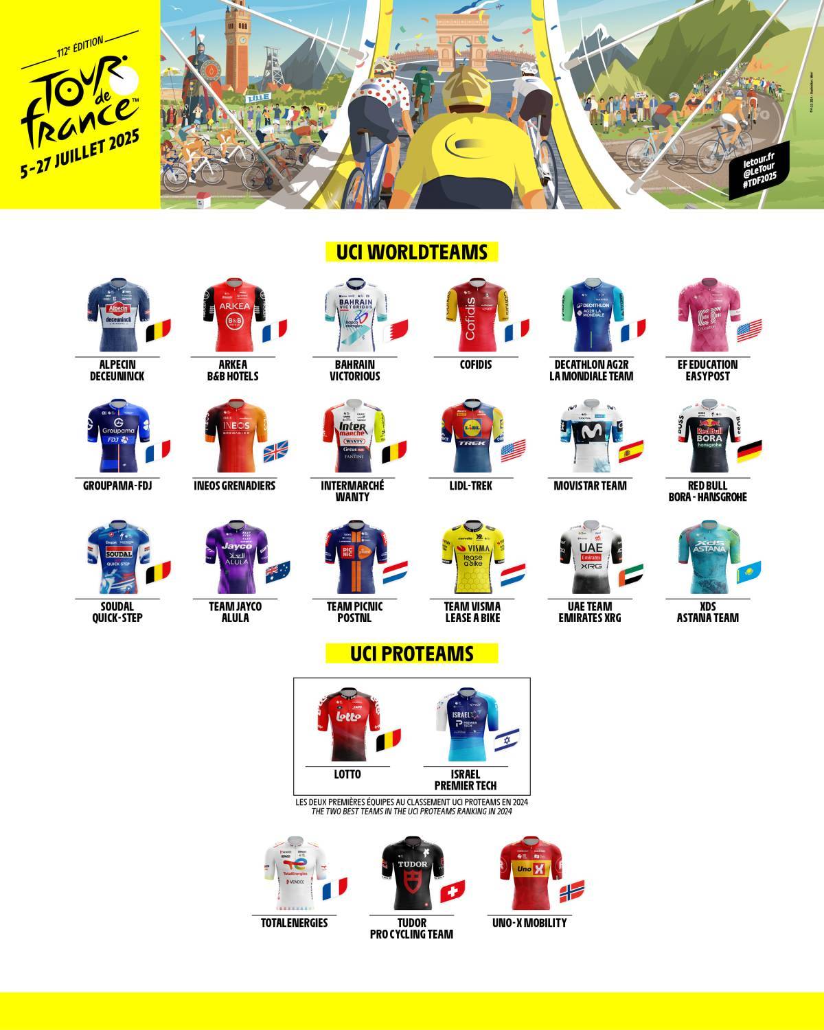 ツール・ド・フランスを主催するA.S.O.(アモリ・スポル・オルガニザシオン)が3月31日、2025年大会に出場する23チームを正式に発表。ワイルドカード(主催者推薦)として、トタルエネルジー、ウノエックス・モビリティ、そして初出場となるチューダープロサイクリングチームが選出された。