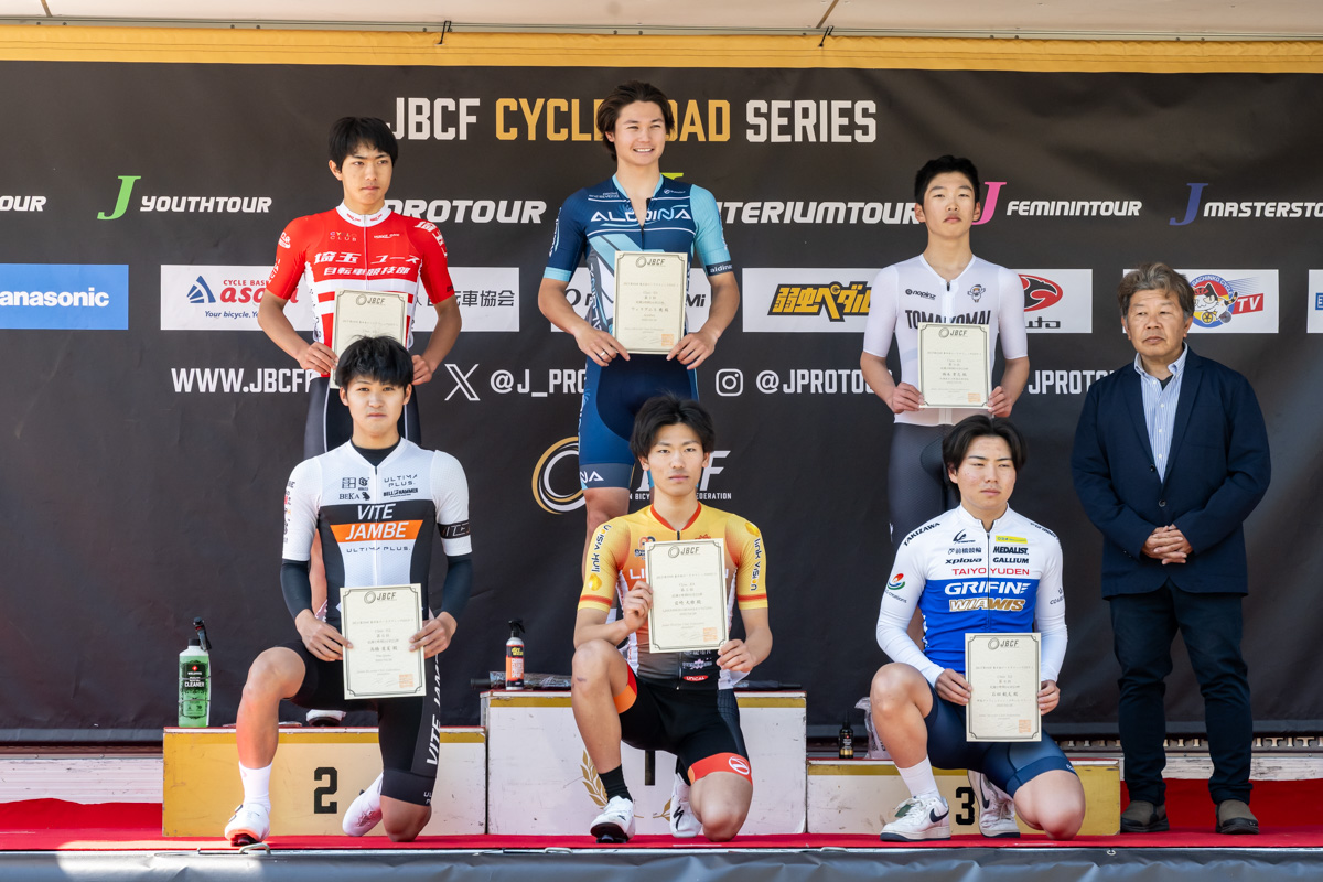 後続集団のゴールスプリントでは、チームメイトの高岡亮寛が力を見せつけ2位に入り、Roppongi Expressが昨年に続きワンツーフィニッシュを達成。「去年は高岡さんと木村(裕己)さんでワンツーして、僕は全然集団からも遅れてゴールだった。その悔しさがあって、雪辱を果たせたかな」と、大前はチームでの勝利を喜んだ。3位には、集団スプリントで初のE1レースとなった17歳の住田悠人(AVENTURA VICTORIA RACING)が入り、そのポテンシャルの高さを示した。なお、Jエリートツアーリーダーの奥田は集団内でレースを終え、13位でリーダージャージを守った。