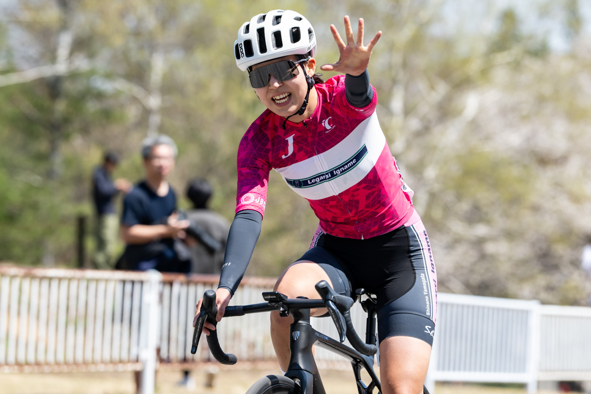 最後の上り区間、阿部が満を持して再びアタック。これまで食らいついていた石川もこのアタックには対応できず、阿部が独走状態に。そのまま力強くフィニッシュラインを駆け抜け、勝利の証として5本の指を広げた。「珍しく長い距離だったので後半勝負だと思って、勝負どころを見極めて自分から仕掛けられたので、展開的には良かった。でも高校生の石川選手が強くて、最後は一杯一杯でした」とレースを振り返ったが、その走りは盤石だった。