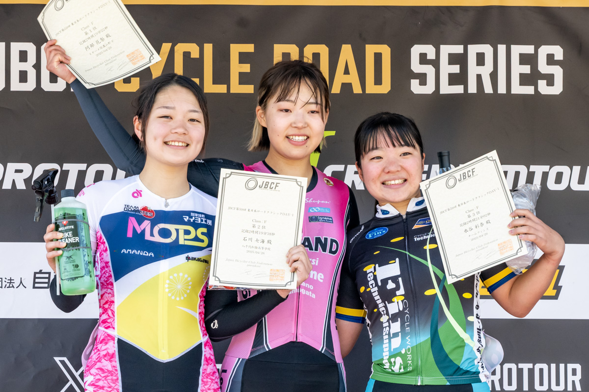 最後まで粘り強く走った石川が16秒差の2位。後続の集団スプリントでは、水谷彩奈(チームフィンズ)が制し3位に入った。