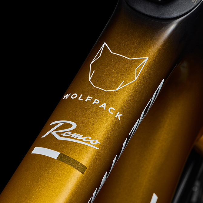 トップチューブには、レムコのロゴと彼のチームの象徴である「Wolfpack」のアイコン、そして彼の驚異的な業績を称える白と金のバンドが施され、限定モデルならではの所有欲を満たすディテールとなっている。