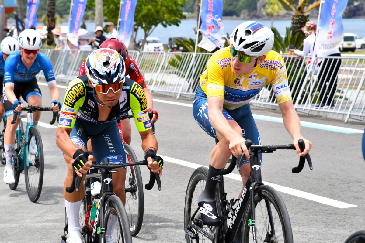 パレード走行を終えて、太地漁港を臨む登坂区間から総合成績のジャンプアップを狙う選手を筆頭に仕掛け合いが始まる。2周回完了時に設定されたスプリントポイントを、岡篤志(宇都宮ブリッツェン)が先頭で通過。続いたドゥシャン・ラヨビッチ(ソリューション・テック・ヴィーニ・ファンティーニ)もポイントを加算すると、ポイント賞ジャージ獲得が決定的に。