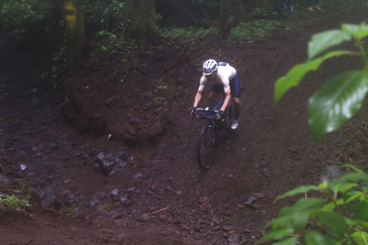 森の中のグラベルをじゃりじゃりと行く。すぐに霧が立ち込めはじめ、ゴールまでずっと濃い霧の中を走ることになったが、乳白色の霧の向こうに砂利道が消えていく風景は幻想的で、個人的にはこんな景色の中を走れて幸せだった。