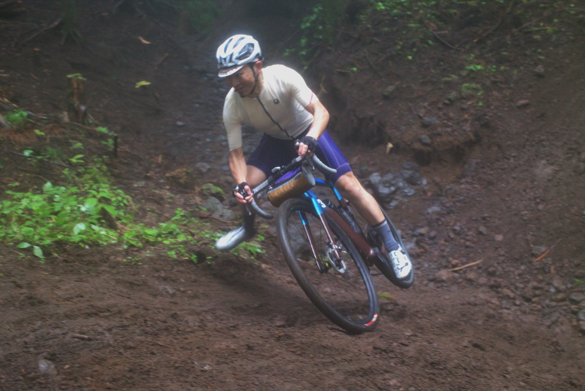 とはいえ筆者はえぐれて谷になっている箇所に無謀にもチャレンジし思いっきりコケで泥とお友達になったが。仲間に「ナイスチャレンジ!」と喝采をもらって照れ笑い。いい大人がコケて泥まみれになって笑い合えるのがグラベル遊びのいいところ。