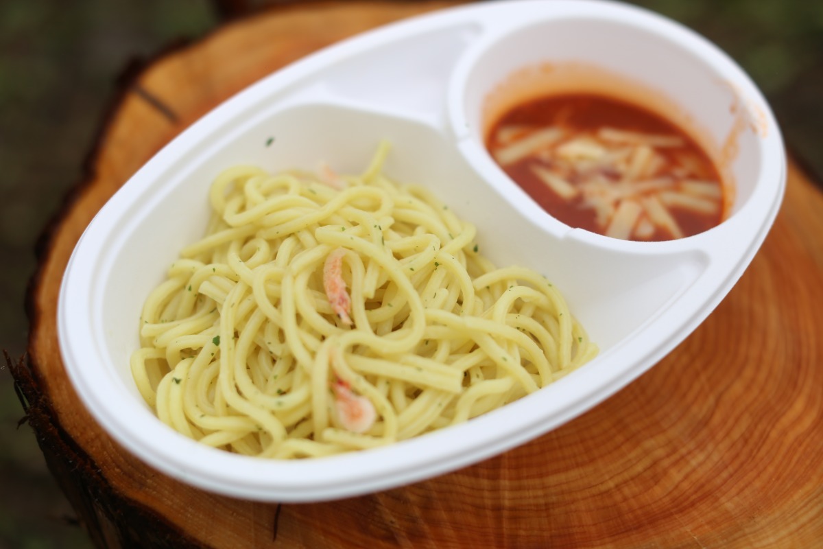16km地点の第一エイドステーションでは、つけナポリタンが振る舞われた。トマトベースのナポリタンスープに麺をつけてチーズを絡めて食べる富士市のご当地グルメで、「たいして美味しくないのに旅の思い出補正でなんとか体裁を保つ」という当地グルメも多いなか、これは本当に美味しかった。