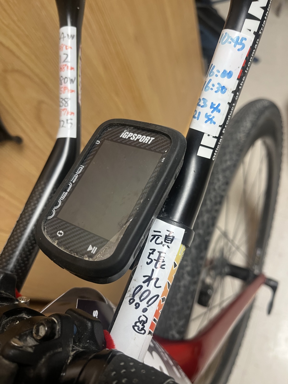 私がDHバーにテープで貼ったタイムプランでは、16:30のエイドアウトでギリギリ「Race the sun」のリミットとして記載していました。