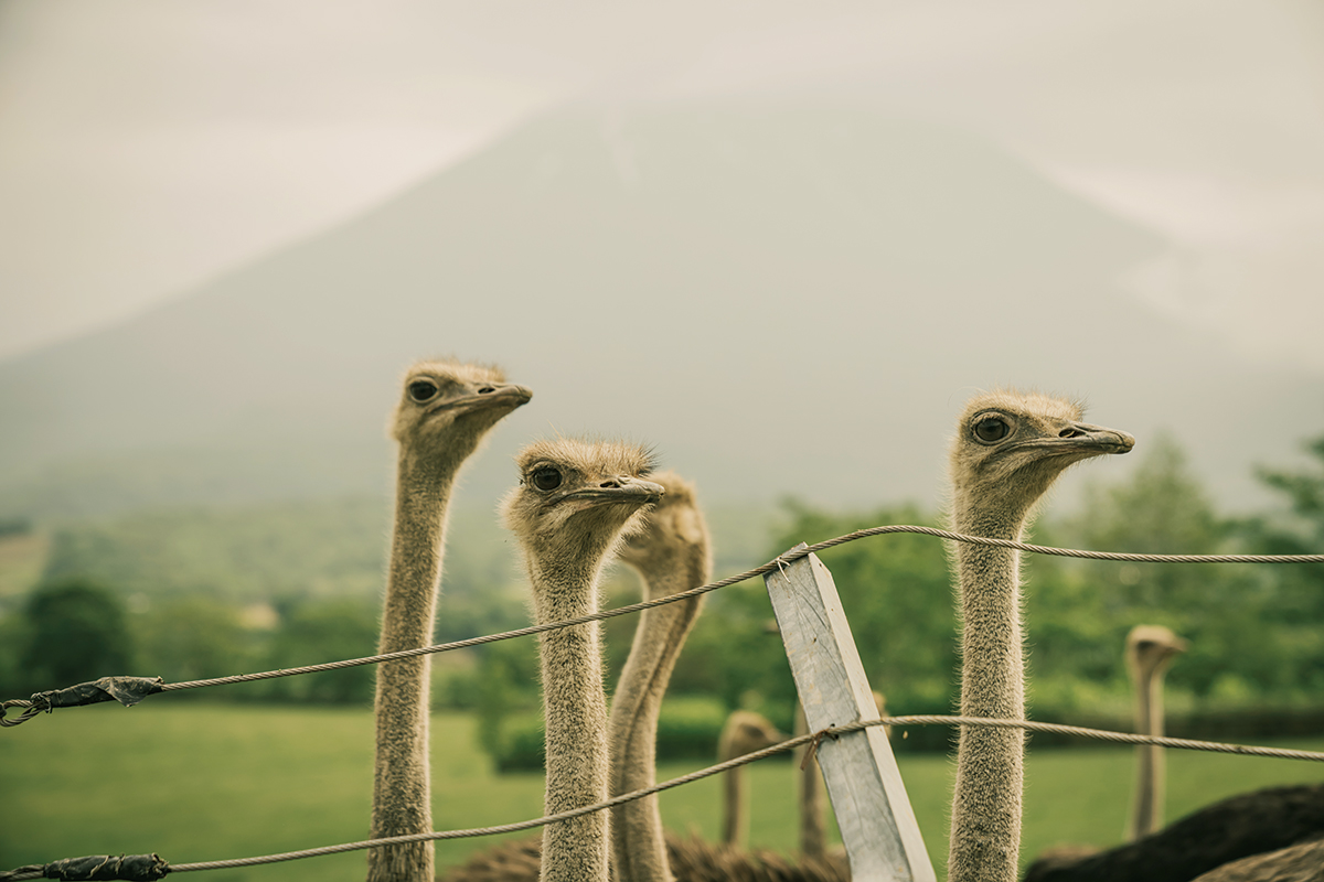 羊蹄山周辺には立ち寄りどころがいっぱい。フォトジェニックな場所を中心にツーリングを楽しことができた。途中立ち寄ったニセコ第2有島ダチョウ牧場では、入場料無料でダチョウと一緒に記念撮影できる。写真撮影しているすきにダチョウに餌袋を丸ごと奪わてしまったが、こんなハプニングも楽しい。