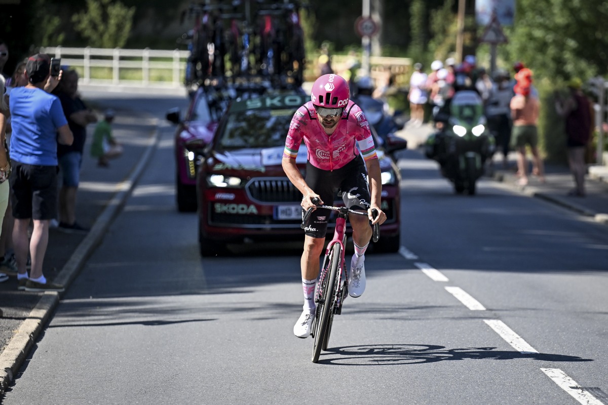 この直後、ヒーリーとクイン・シモンズ(リドル・トレック、アメリカ)がアタック。2人は協調して逃げを試みる。ただ、集団も活性化しており、この日最初のカテゴリー山岳である3級山岳コート・デュ・モン・パンソンで前を行くメンバーがシャッフル。その後もワウト・ファンアールト(チーム ヴィスマ・リースアバイク、ベルギー)がアタックしたほか、3級山岳コート・ド・ラ・ランソニエールではポガチャルやヴィンゲゴーが先頭へと上がる場面もあった。