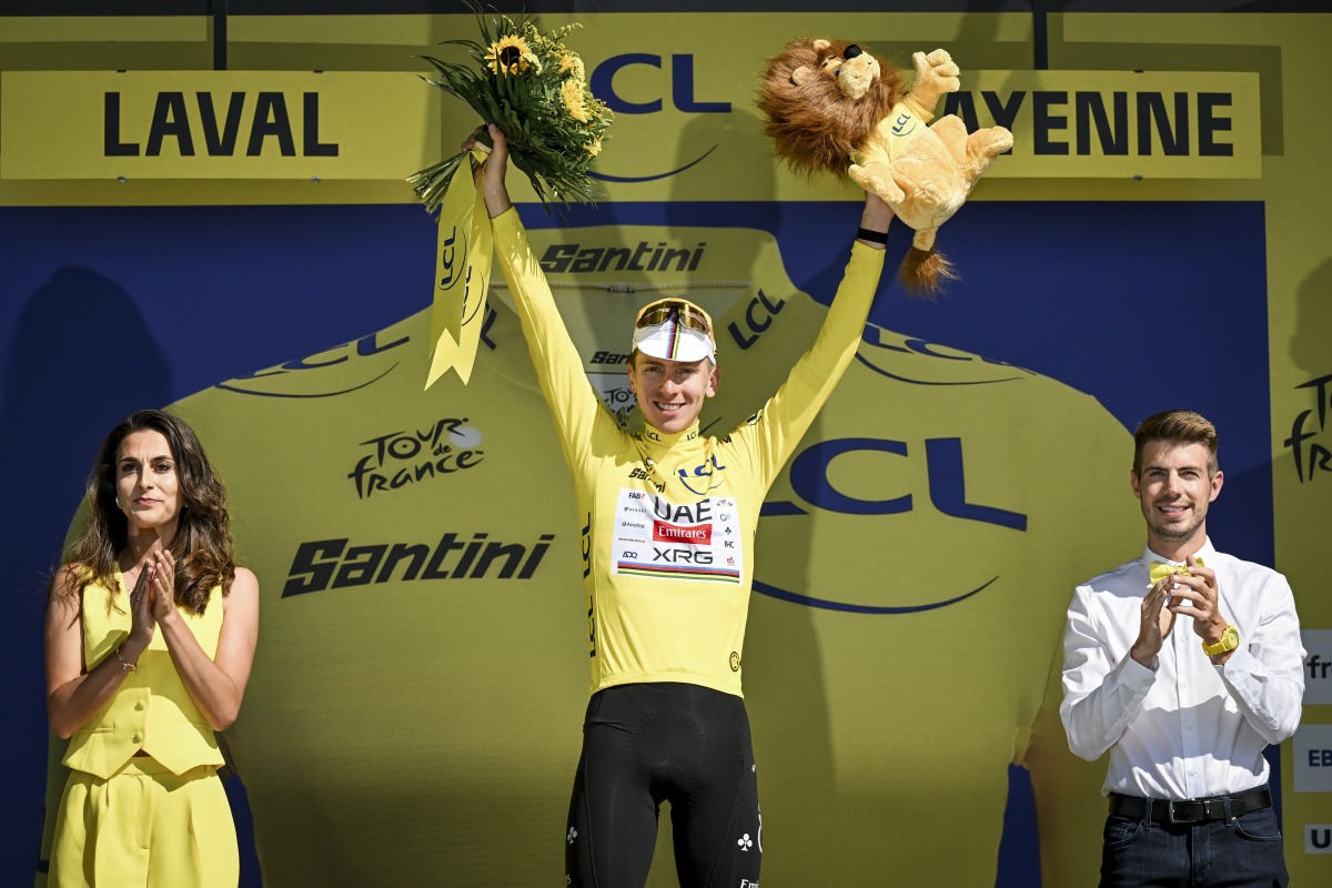 前日のステージを終えて、個人総合ではポガチャルがトップに。マイヨ・ジョーヌを着てレースに臨んだ。