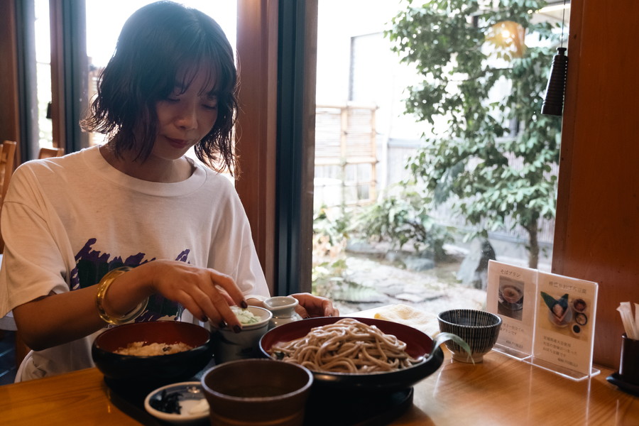 昼食は蕎麦処・安江へ。石臼で挽いた自家製粉の十割蕎麦は、手打ちならではのコシと香りが特徴です。夏らしい冷やしとろろ蕎麦は、滑らかなとろろとしっかりした麺の食感で爽やかな味わい。締めのそば湯まで堪能し、昼食を楽しみました。