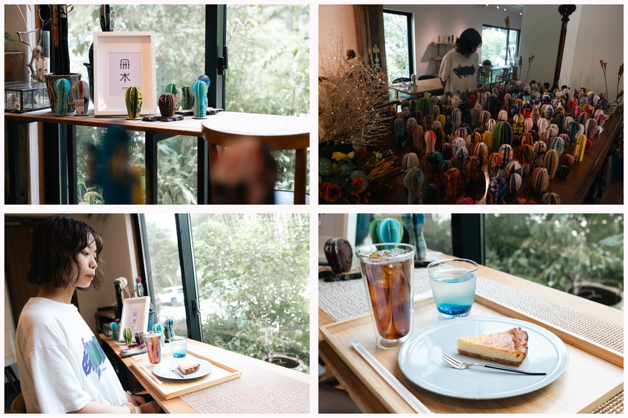 最後に立ち寄ったのはカフェギャラリー・陶片木。喫茶やケーキを楽しむだけでなく、定期的にギャラリー展示も行われています。この日は古紙で作られたサボテンのオブジェが飾られていました。