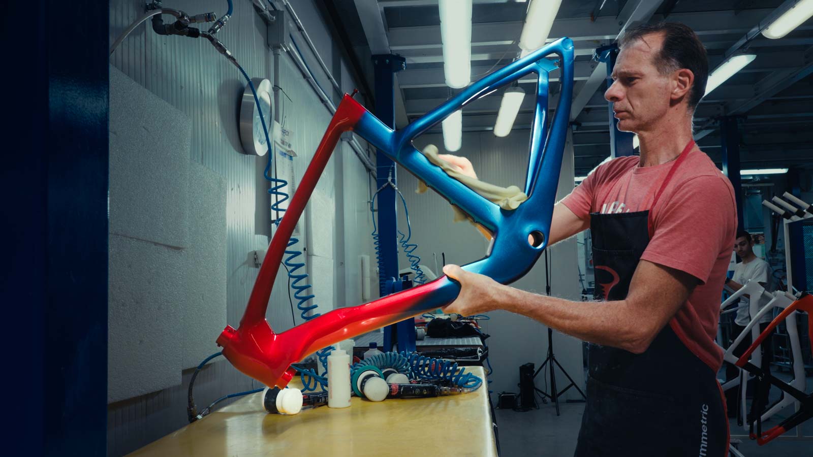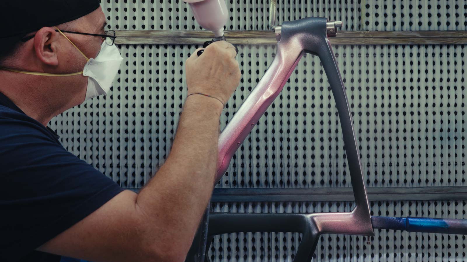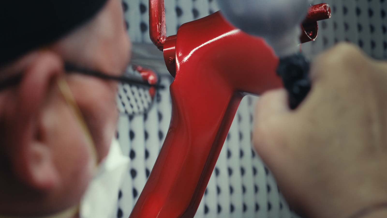 塗装はイタリア、トレヴィーゾの 本社工房にて30年以上の経験を持つ熟練ペインターのみが担当。3Dモデリングでシミュレートされた唯一無二のフレームを手作業で再現する。フレームは丁寧に研磨・下地処理が施され、滑らかでムラのないベース面に。次にマスキングを施し、精密なスプレーガンやエアブラシによって複数層の塗装が重ねられる。