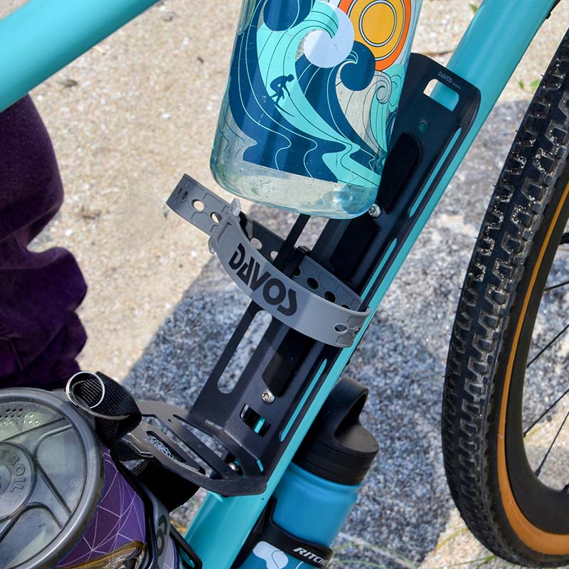 ボトルケージ台座を万能マウントに変える画期的なアダプターとストラップのセット。輪行袋やテントなど、これまで積載を諦めていたアイテムの固定を可能にする。