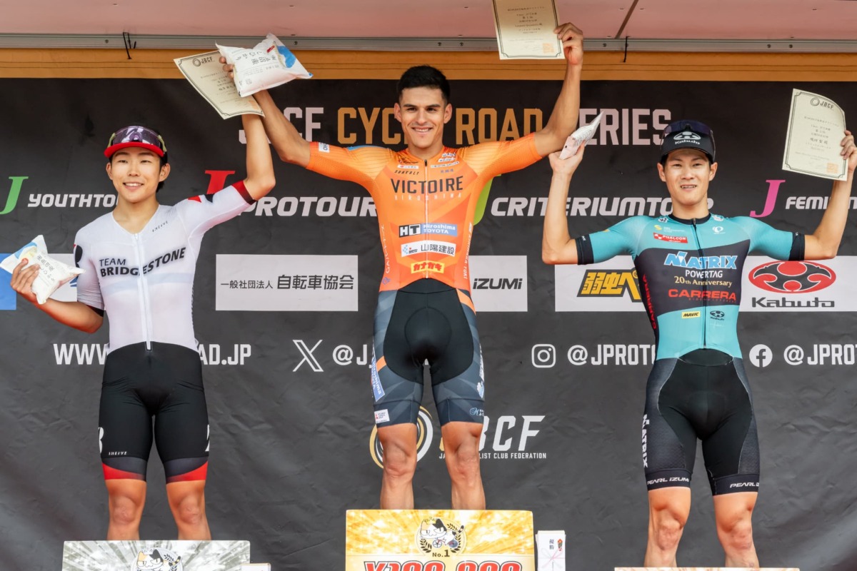 また、E2/E3カテゴリー(18周、22.3km)では、序盤に飛び出した左田龍脩(ブラーゼンサイクリング倶楽部)と行田弦士(明星大学自転車競技部)の2名が逃げ切りに成功し、左田がスプリントで制して優勝した。