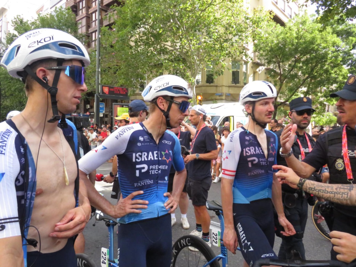 イスラエル・プレミエテックの選手は、ビルバオでのステージ終了後に警察と話し合う姿が目撃された。この時点ですでに、デモ隊からペットボトルを投げつけられるなどの被害を受けていた。