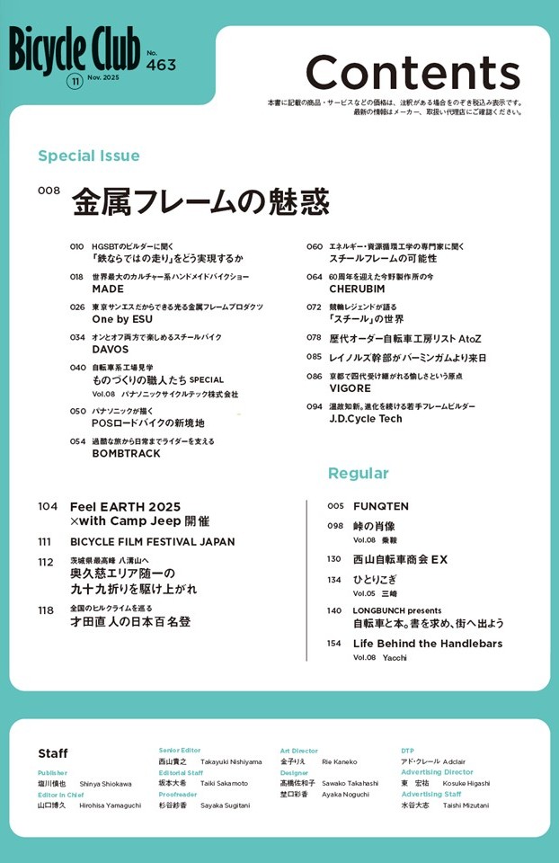 乗りつづけたくなる金属フレームの魅惑|9/20発売「バイシクルクラブ11月号」