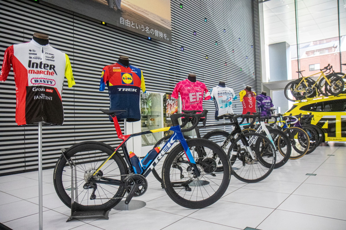 宇都宮ジャパンカップに出場予定のUCIワールドチームのジャージとバイクが会場に展示された © Syunsuke FUKUMITSU