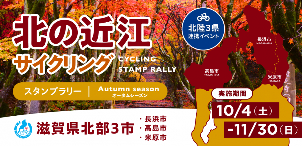 滋賀県北部の魅力を自転車で巡るデジタルスタンプラリー「北の近江サイクリングスタンプラリー」の第2弾(オータムシーズン)が、2025年10月4日(土)から11月30日(日)まで開催されることが決定した。春季に開催され好評を博した企画の第2弾で、今回は景品をさらに充実。北陸新幹線敦賀開業を記念し、北陸3県にもスタンプスポットが設けられる。