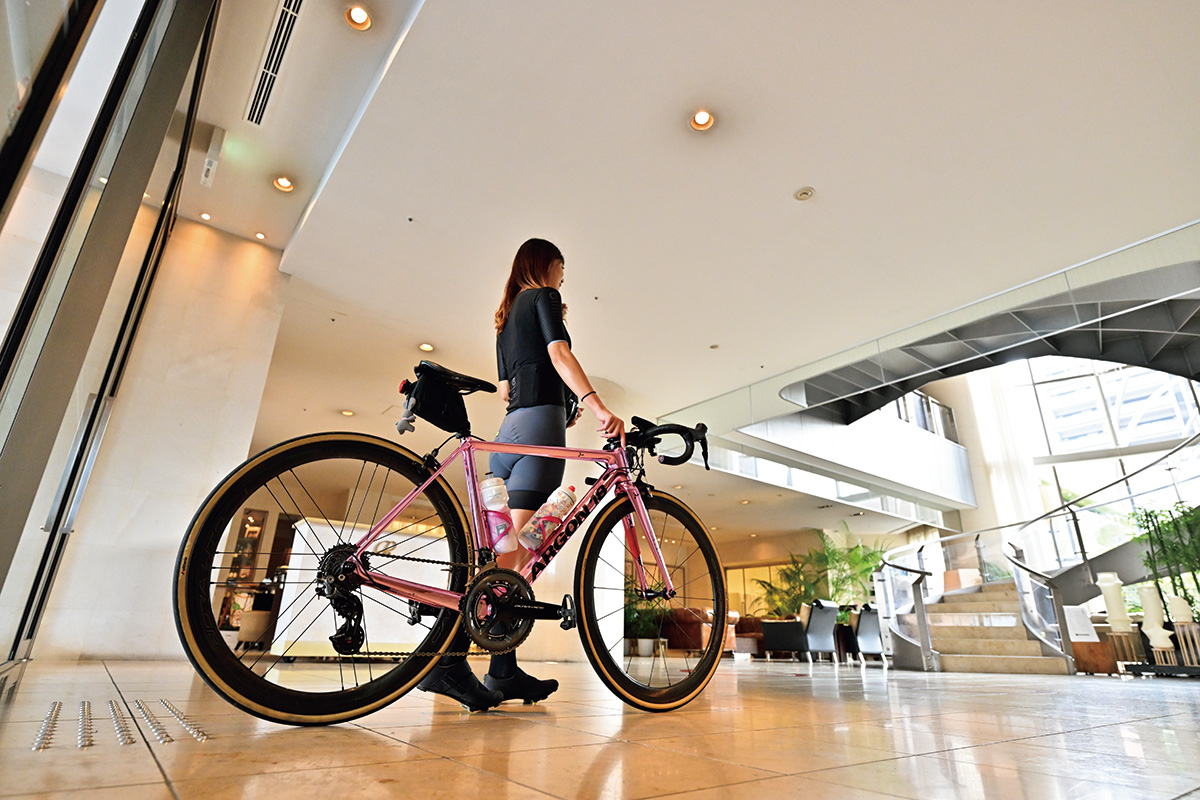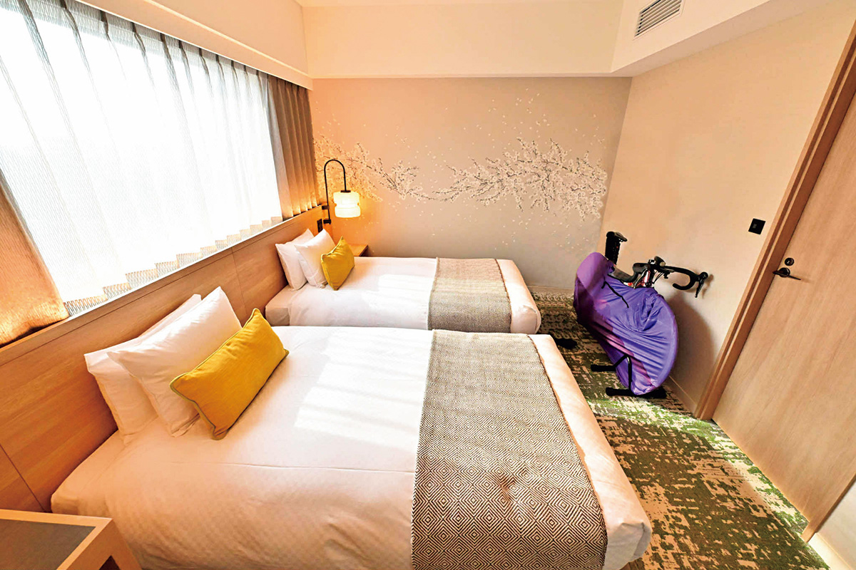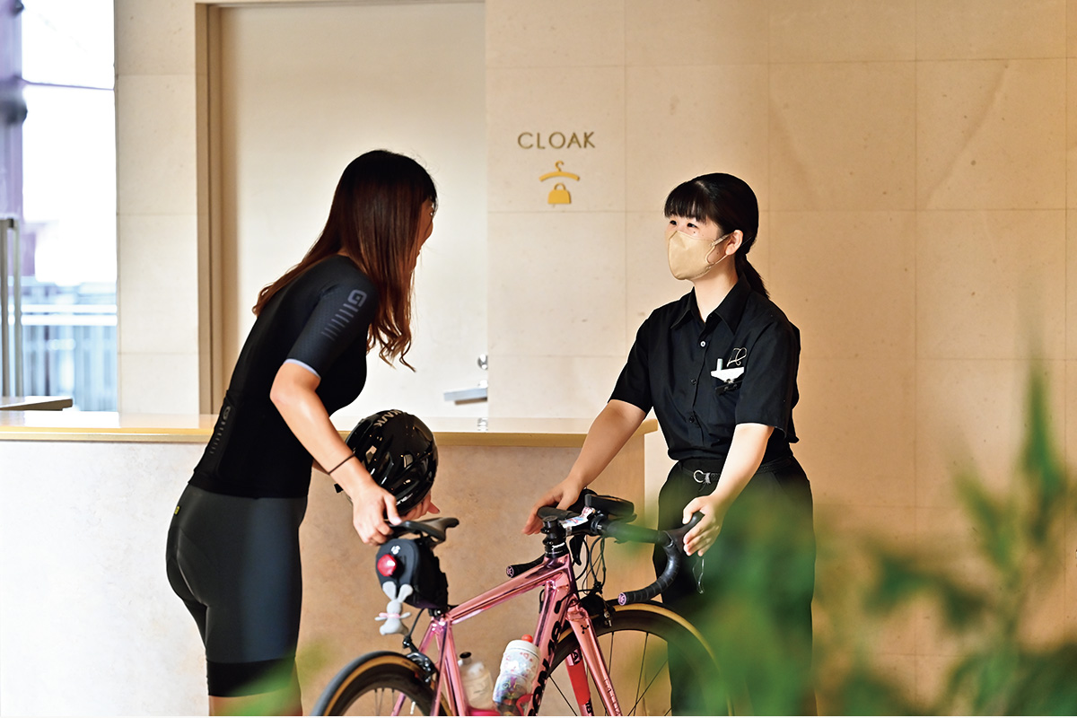 最も嬉しいのは、自転車の館内持ち込みに対応していること。仲谷さんも「スタッフさんがとても親切で丁寧。自転車を持ち込めるだけでなく、専用スタンドとカバーまで貸してくれるサービスに感動しました」と語る。大切な愛車を客室で保管できる安心感は大きい。また、クロークでの保管も可能だ。