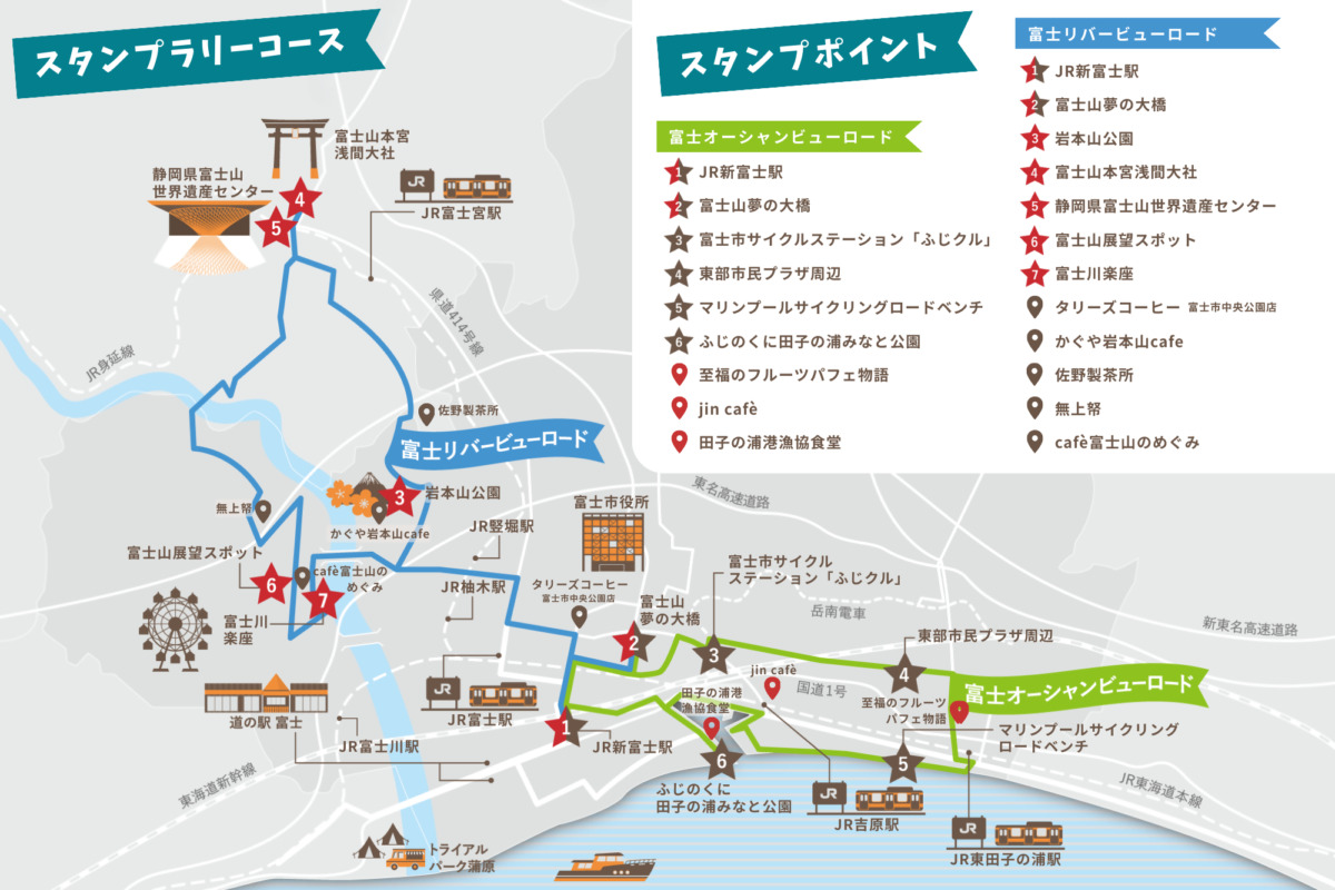 実証実験の目玉となるのが、JR東海のポイントアプリ「TOKAI STATION POINT」を活用したデジタルスタンプラリーだ。レンタサイクルの利用者以外も参加可能で、富士市内に設定された絶景スポットやグルメスポットを巡り、QRコードでスタンプを集める。
