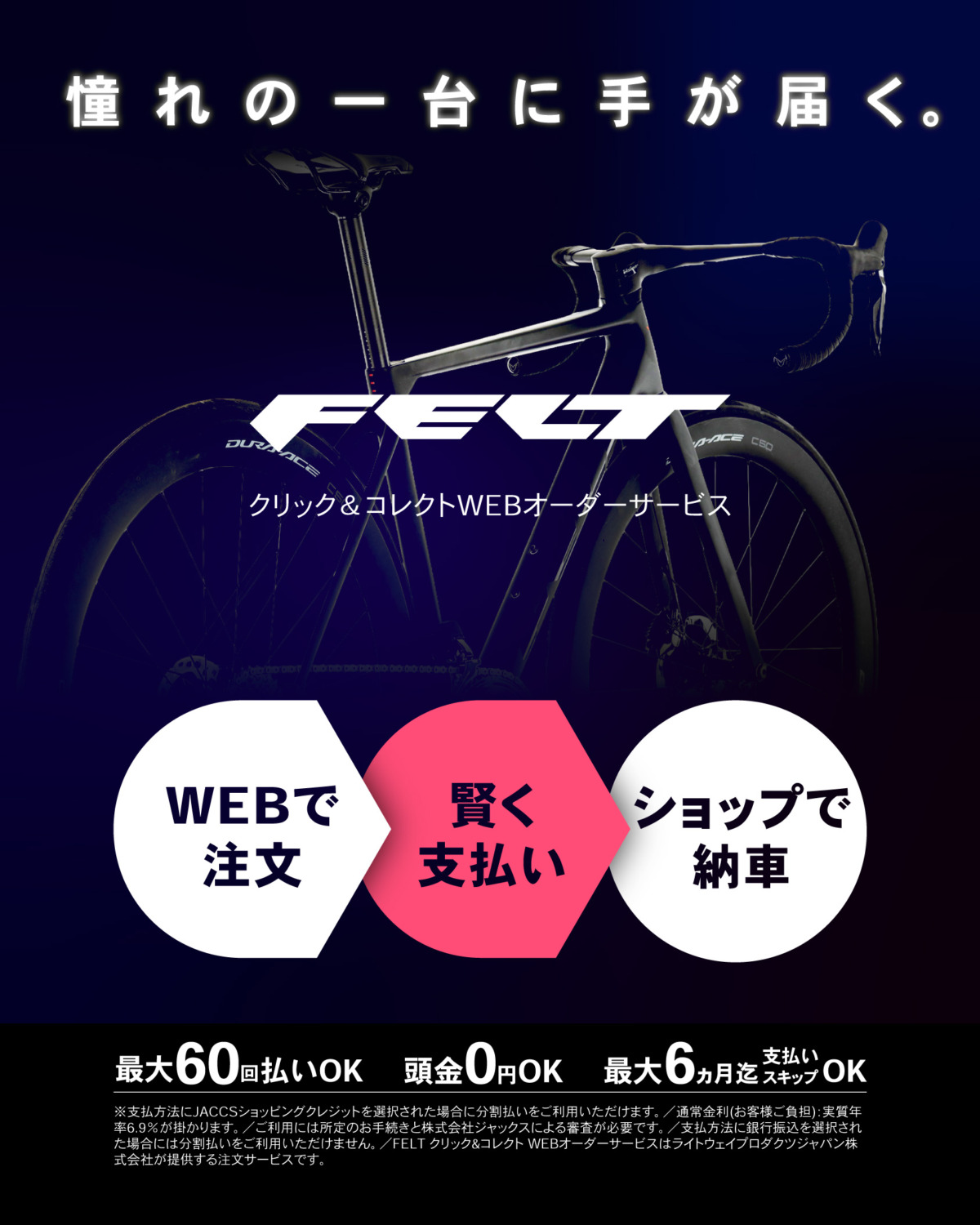 本サービスは、オンラインでFELTの自転車をご注文、希望の支払い方法を選択し、全国の提携FELT取扱いショップにて納車を受けることができる新しい注文サービス。