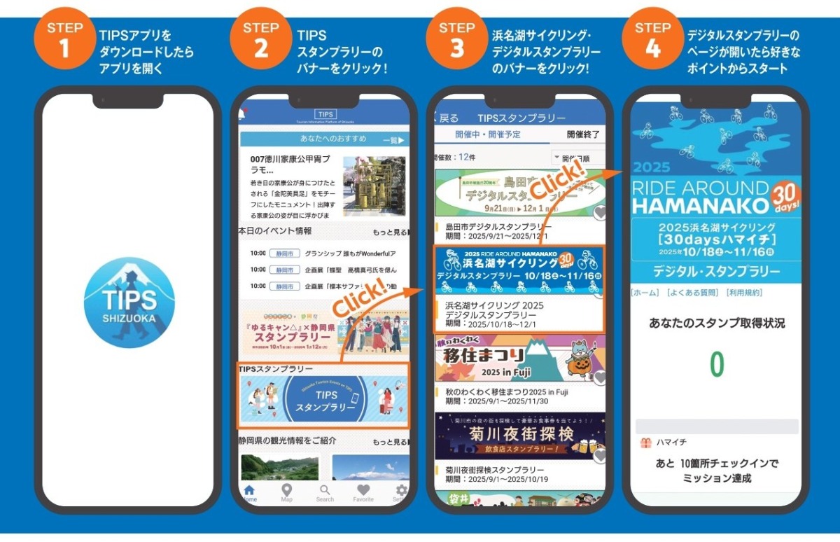 スマートフォンアプリ「TIPS(外出リンク)」を利用し、浜松・浜名湖エリアに設置された約50か所のチェックポイントを巡るデジタルスタンプラリー。GPS連動でスタンプを獲得し、ポイント数に応じて景品応募も可能。定員制限はなく、初心者から上級者まで気軽に参加できる。