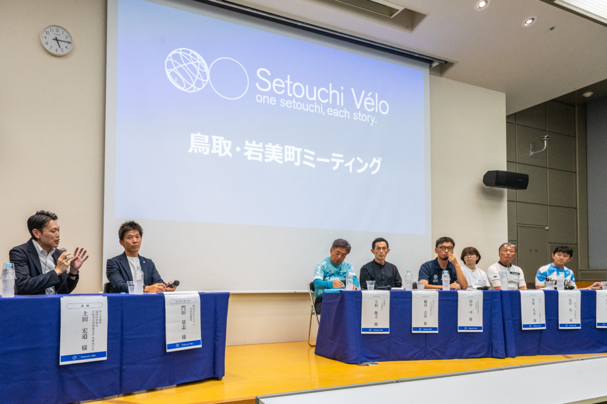 トライアルライドの後、メンバーは鳥取市のとりぎん文化会館へ移動し、Setouchi Vélo協議会ミーティングが開かれた。冒頭では開催地を代表して岩美町副町長の田中祥一氏が挨拶をし、岩美町が自然や温泉、サイクリングなど多彩な地域資源を活かし観光振興を進めていることを紹介した。