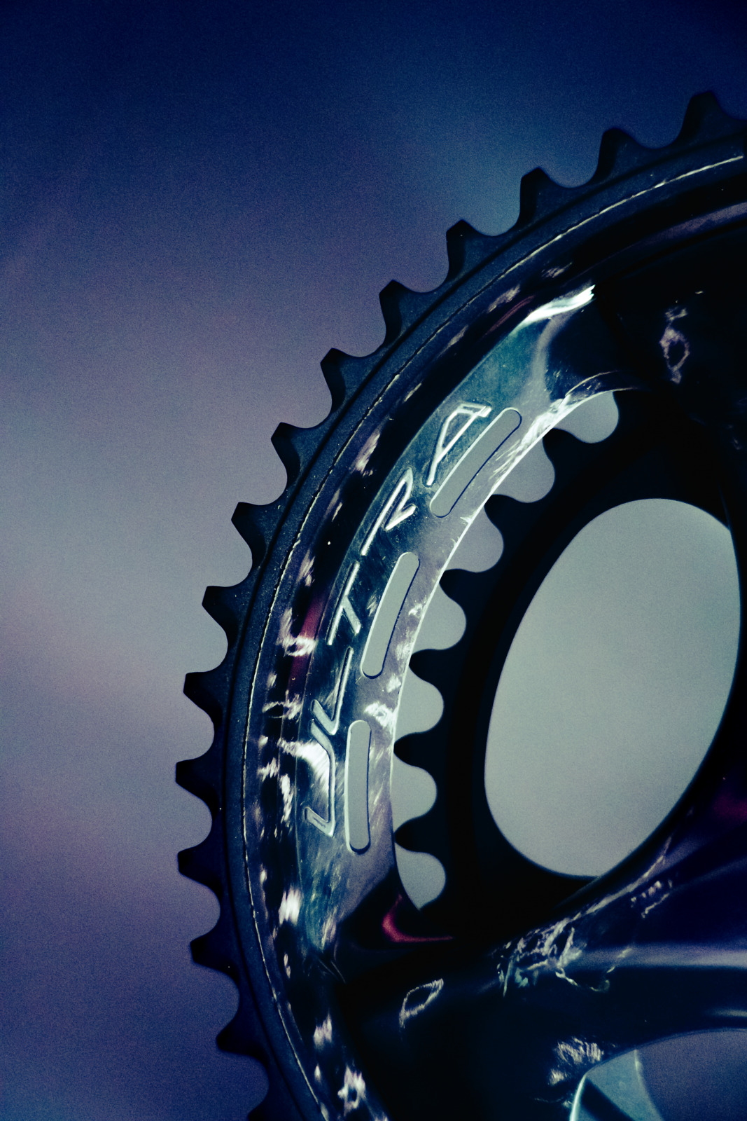 カーボンファイバーによって絶対的な剛性を確保し、ペダリングのデッドスポットを通過する際も一貫したパワー伝達を実現。航空機にも採用される7075アルミ製の歯先には、耐久性を高めるための特別なハードアノダイズド熱処理が施されている。