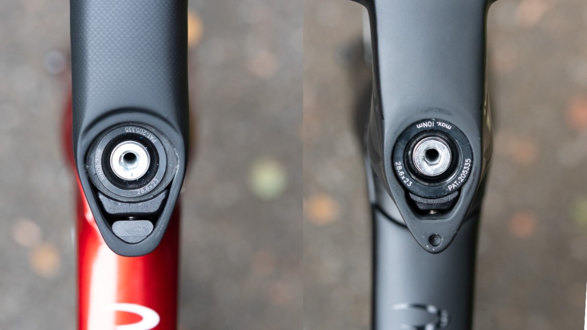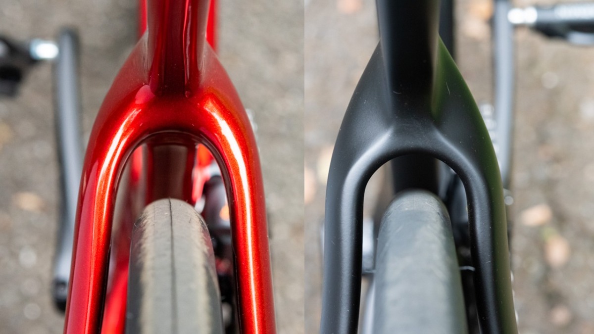 フォークコラムは前作の真円断面(右)から、横方向に広い楕円断面(左)に。これによってブレーキケーブルのルートがコラム両脇からコラム前面へと移動した。ヘッドチューブを縦に薄くして空力性能を向上させるためだ。