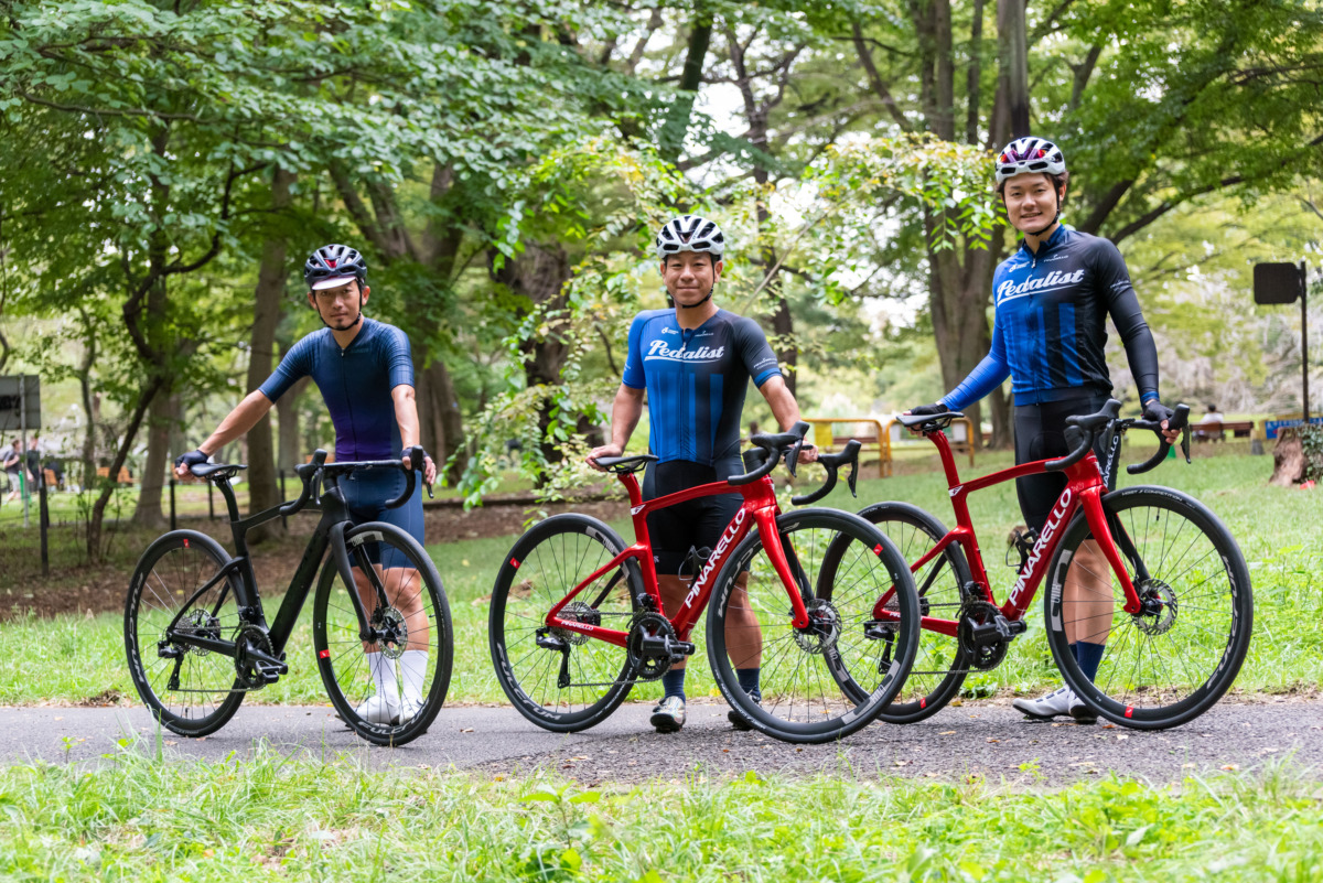 今回はピナレロを専門に扱うショップ、「ペダリストピナレロショップ横浜」の山崎泰史店長と、「ペダリストピナレロショップ青山」の福本 元店長という2人のスペシャリストと共に、新型F7の試乗を行った。
