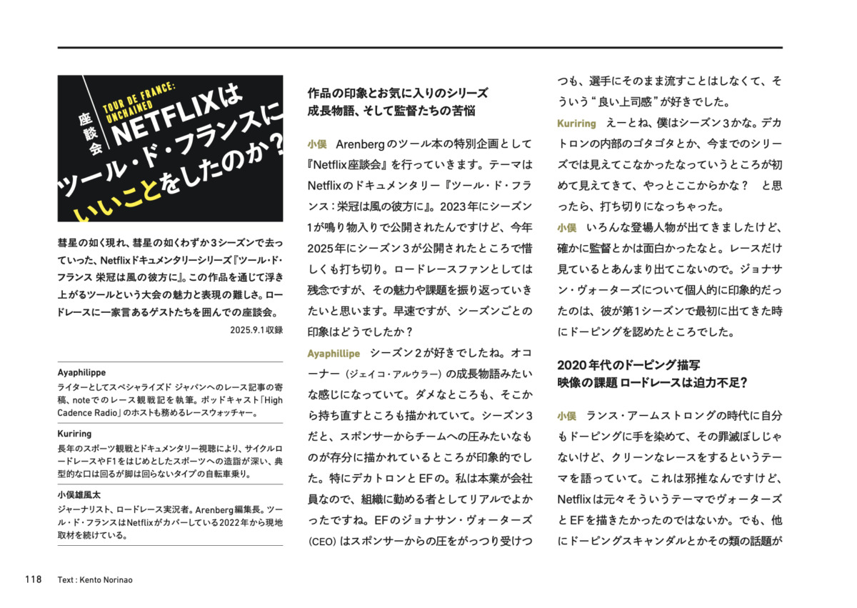 また、近年大きな話題を呼んだNetflixのドキュメンタリーシリーズについては、レースウォッチャー3名による座談会「Netflixはツール・ド・フランスにいいことをしたのか?」を収録。こちらはポッドキャストとの連動企画としても楽しめる。