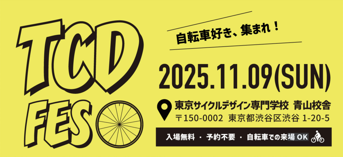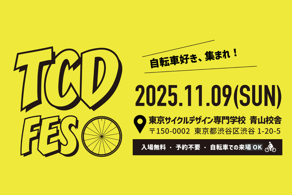 日本で唯一、自転車を総合的に学ぶ認可専門学校である東京サイクルデザイン専門学校(TCD)が、年に一度の文化祭「TCDフェス 2025」を、11月9日(日)に同校の渋谷キャンパスにて開催する。在校生や卒業生、そしてCHERUBIMをはじめとする人気プロショップが一堂に会し、フリーマーケットやワークショップ、トライアルショーなどを通じて、自転車カルチャーの“今”と“未来”を体感できる一日となる。