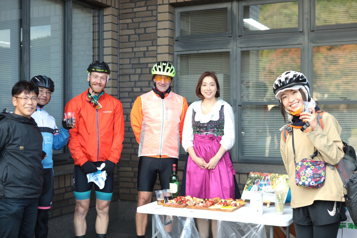 パケ大使は「日本一のサイクリングルートを楽しめた」とコメント。続いてスピテリ大使は日本語で挨拶をし「私はあまり自転車には乗らないので60㎞はチャレンジでした。最初は天気が悪く大変だったけど、後半は太陽が出てすごくよかった。ありがとうございました」とサイクリングを満喫した様子、みな笑顔で集合写真を撮影し締めくくった。
