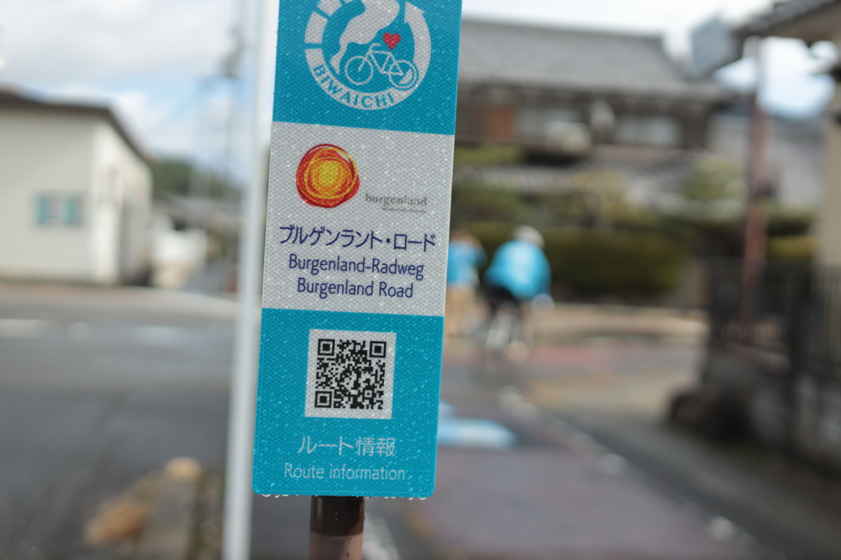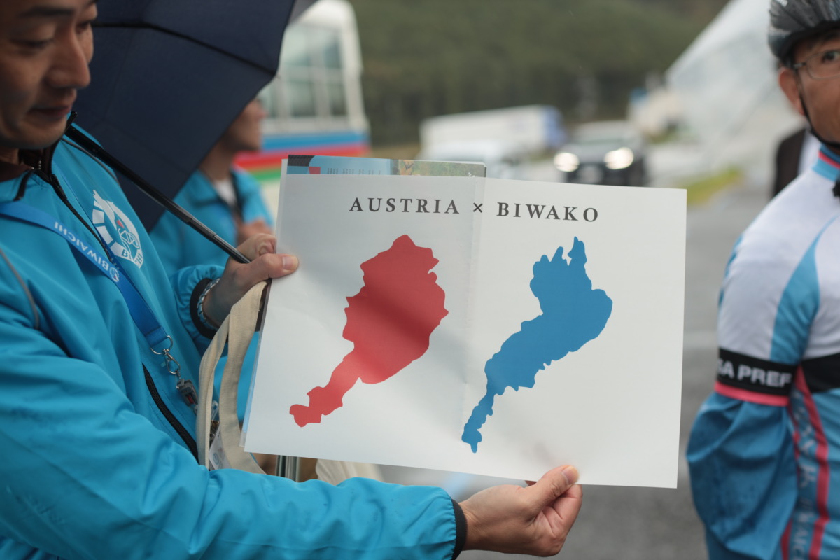 三日月知事一行は守山市の第2なぎさ公園をスタートしてから湖岸を北上し、近江八幡市の渡合橋で小休止。そしてオーストリア・ブルゲンラント州との交流を象徴する「ブルゲンラント・ロード」をライドした。