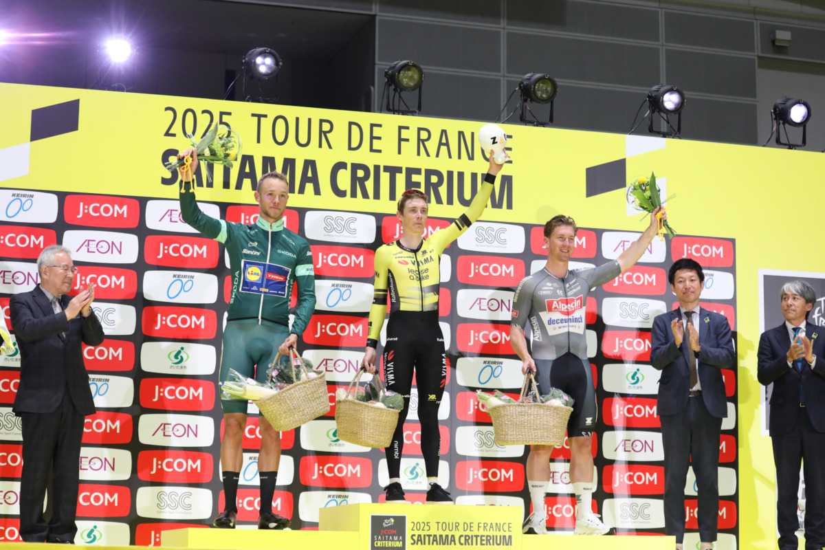 豪華な選手達の競演により、興奮のレースとなったJ:COM presents 2025 ツール・ド・フランスさいたまクリテリウム。さいたまスーパーアリーナで行われた表彰式では、埼玉県産野菜のブーケなどが贈られ、世界に向けて「日本」「さいたま」を発信した1日となった。