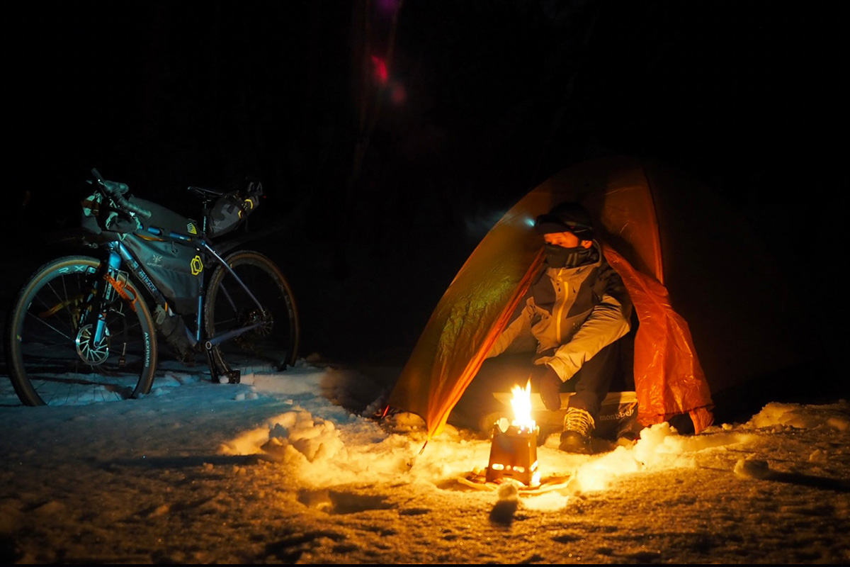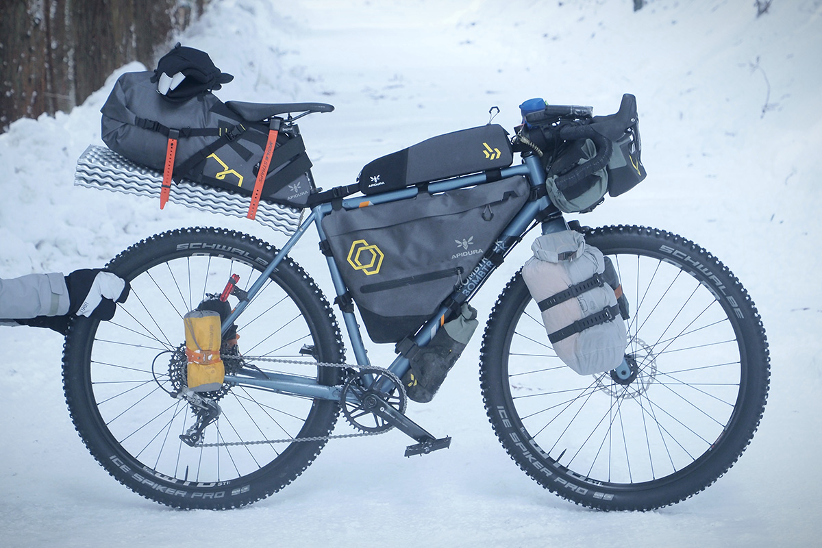 ▲雪中キャンプの装備をバイクパッキングスタイルで積載。この姿がよく似合う。