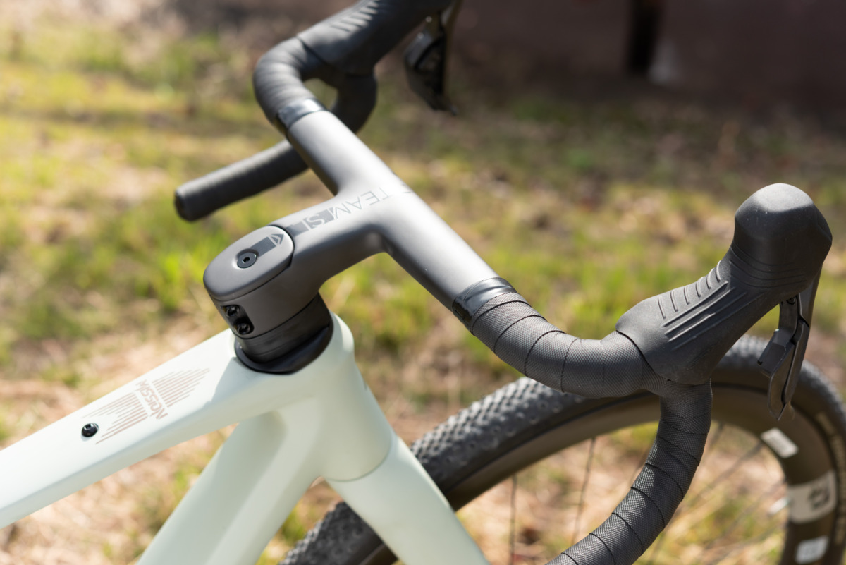 MERIDA TEAM SL GR1P コックピットは一般的なグラベルバイクのフレアハンドルとは違い、下ハンドルを握ったときにロードバイクの感覚のまま使える形状になっている。具体的には上の写真にあるように、外側にむかってアールを描きながら曲がっているため手首に無理のないポジションがとれる。