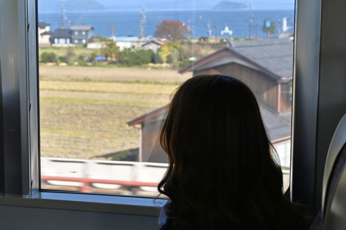 進行方向右手に琵琶湖を眺めつつ、10分ちょっとのローカル線旅。短い時間でも、なんだか旅情たっぷりでいいんですよね。