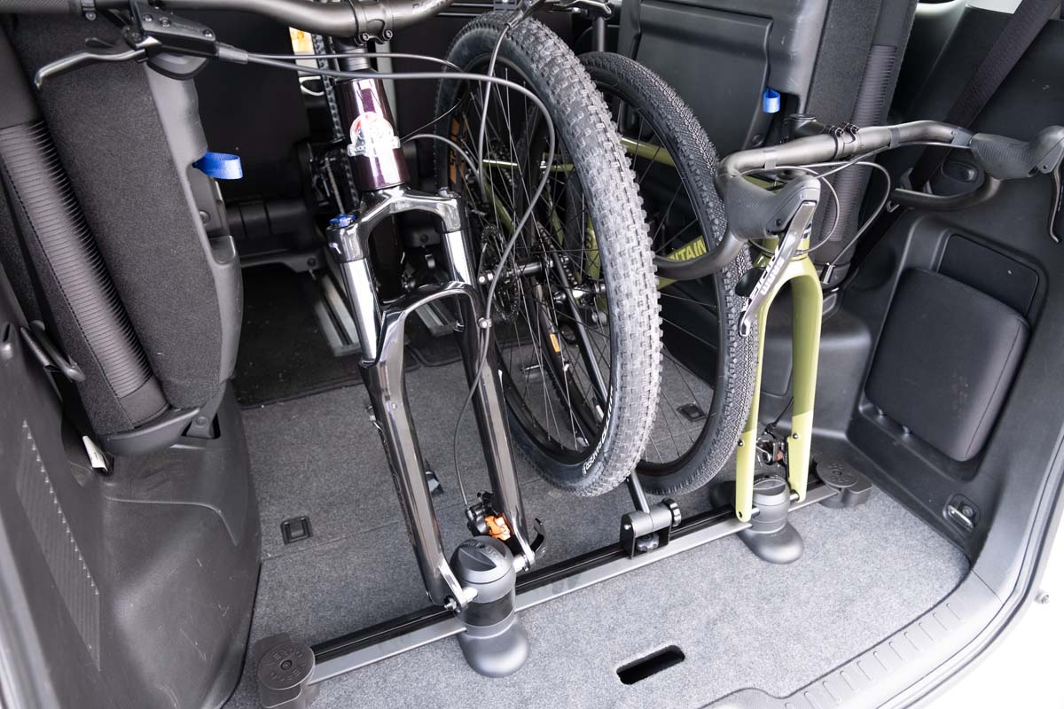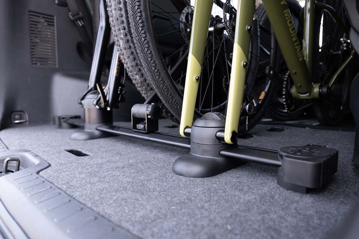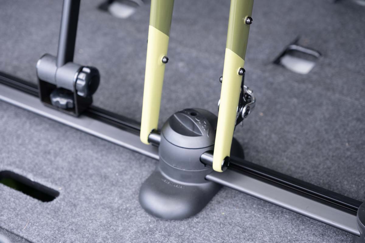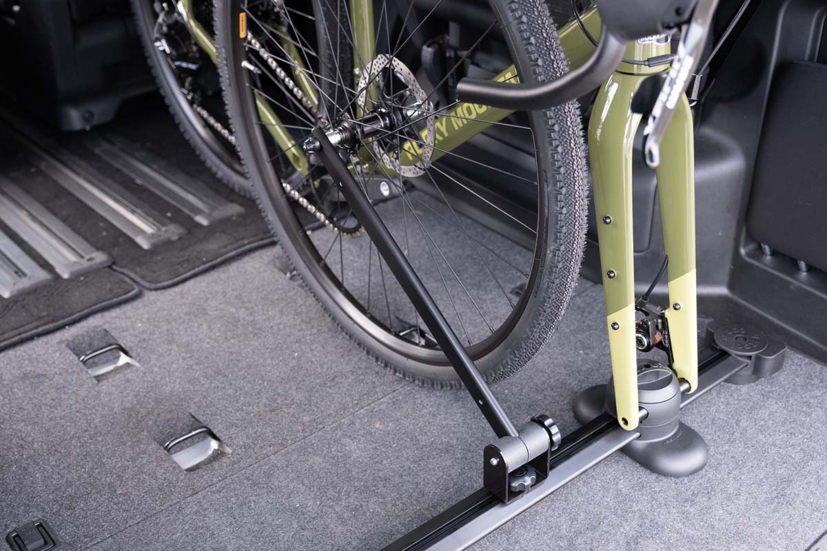 ベースレールの長さは汎用性の高い990mmを採用。ハイエースやキャラバンなどのトランスポーターはもちろん、画像にあるセレナのようなミドルサイズのミニバンやステーションワゴンにも収まりが良いサイズ感だ。レール長には余裕があるため、別途フォークマウントを追加すれば2台積載にも対応する拡張性も持っている。