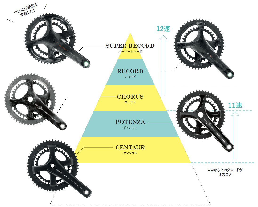 カンパニョーロとしてはシマノ・デュラエースに相当する事実上の最上位グループセット(レコードは特別仕様という位置づけ)で、上位グレードとの差は素材の差のみ、デザインもレコードと同じというグループセット。電子式グループセットなども展開し、カンパニョーロの素晴らしさを存分に味わえる。