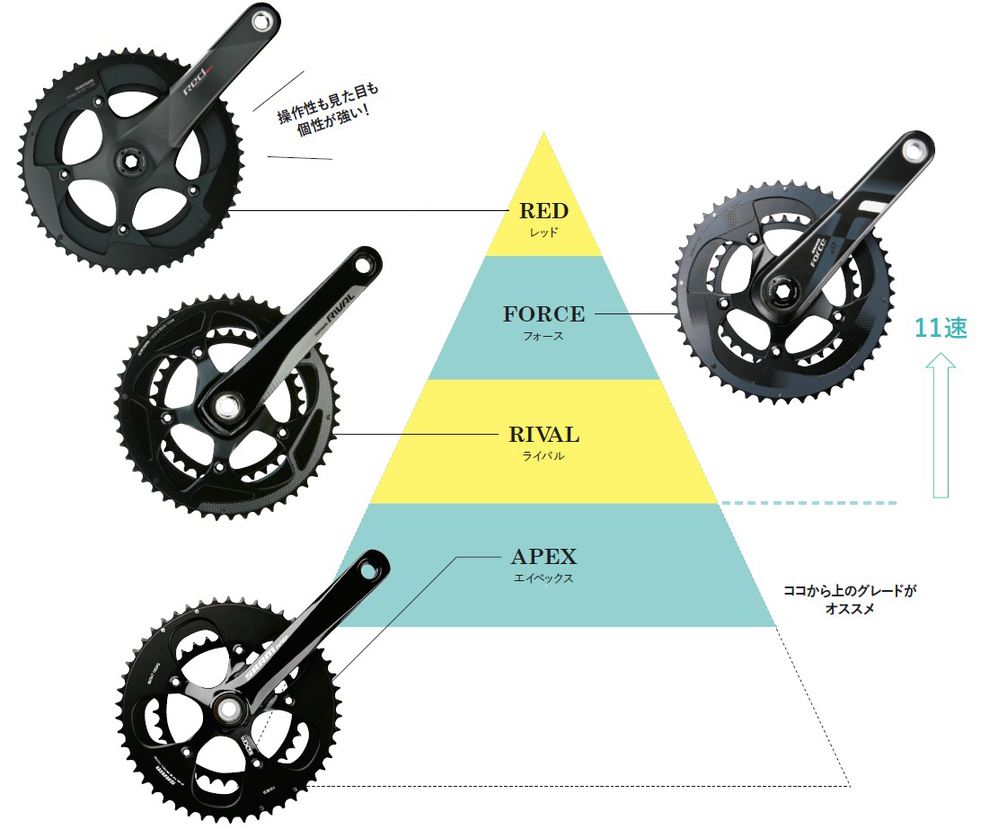 ダブルタップテクノロジーの直感的な操作や正確な変速といったスラムの特徴を、より多くのユーザーに届けてくれるミドルグレードのグループセット。ライダーがロードバイクのコンポーネントに求める性能の多くを満たしており、レースからツーリングまで幅広いライディングスタイルをカバーできる。