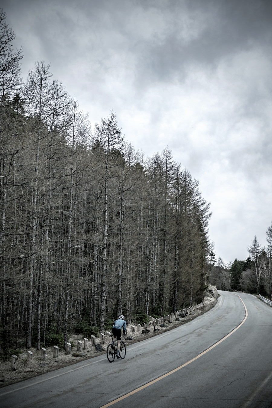 しかしクライマーズ・ハイに至ることはない。ある時点でふと我に返る。だいたいそれは2合目の標識が目に入ったときだ。まだまだ山頂は遠いことに気付かされ、一枚ギヤを軽くしてペースを落とす。無機質な道路と直線的な針葉樹にひとり取り残されたような孤独を覚えるが、進むしかない。周囲を取り巻く木々はコメツガに変わっている。